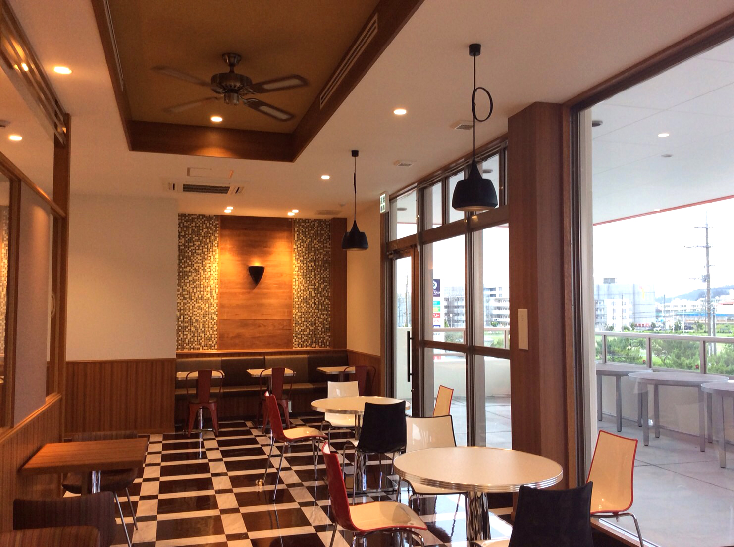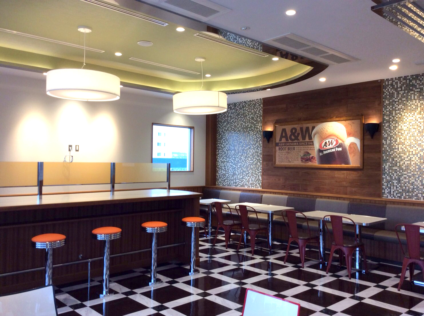 海風がここちよい、2階建てのA&Wです。はじけるような爽快感とクリーミーな泡で大人気のA&Wオリジナルドリンク”ルートビア”とビーフ、トマト、レタス、オニオンリングそして濃厚なクリームチーズにペッパーポークがはさまった”The A&Wバーガー”がおススメです。ルートビアは、店内では毎日おかわり無料。2階席では、ミーティングやモアイなどグループでのご利用もできるような空間を提供しております。